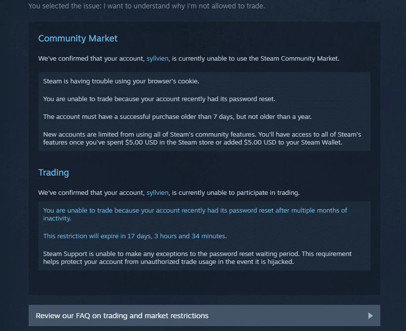 Want to see the list of all Trade and Community Market time restrictions? Go to the Steam official support guide. We also have a convenient list available here.