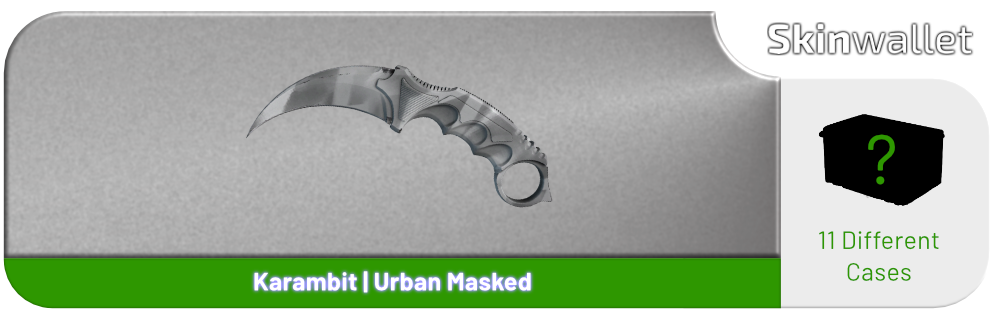 Когда речь заходит о дорогих ножах, то первое, что приходит в голову - это стильный нож с изогнутым лезвием под названием керамбит. Хотя скин “Городская маскировка” не пользуется таким же высоким спросом как “Волны” или “Поверхностная закалка”, данный факт не означает, что этот скин не является очень редким. За наивысшее качество - просто с завода - придется заплатить около 1000 долларов. Мы не припомним, чтобы новый Керамбит | Городская маскировка с технологией StatTrak кто-либо выставлял на продажу. Если таковой появится на рынке в ближайшее время, то его ценник будет составлять из пяти знаков.